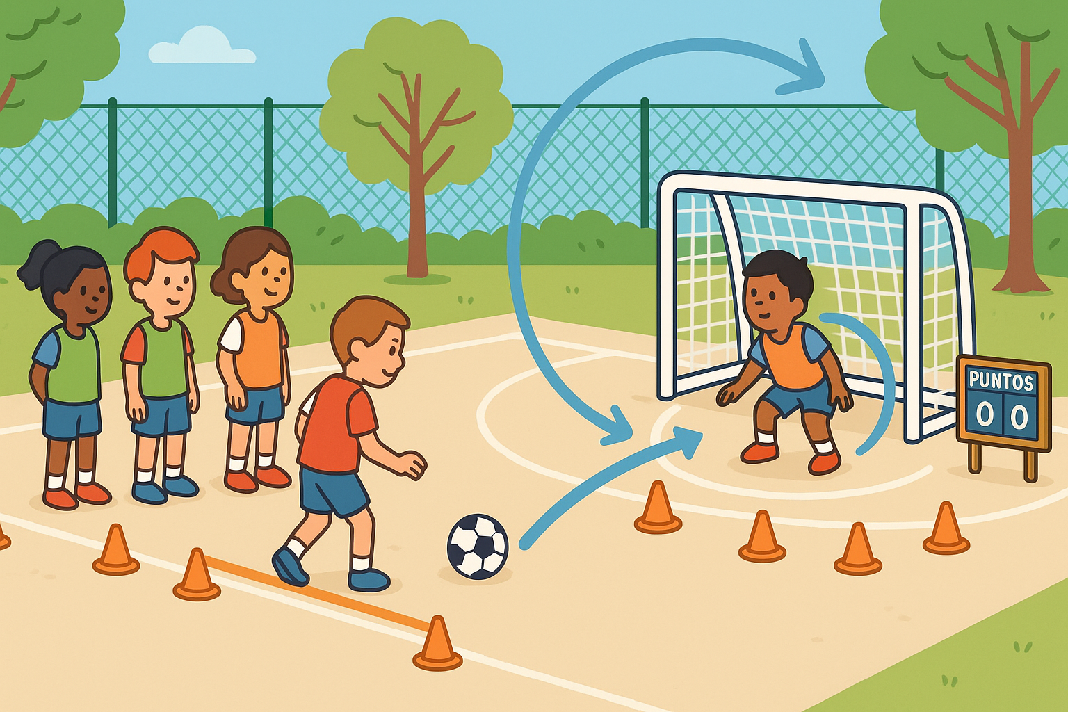 - Delimita una zona de tiro a 6–10 m de la portería (según edad).