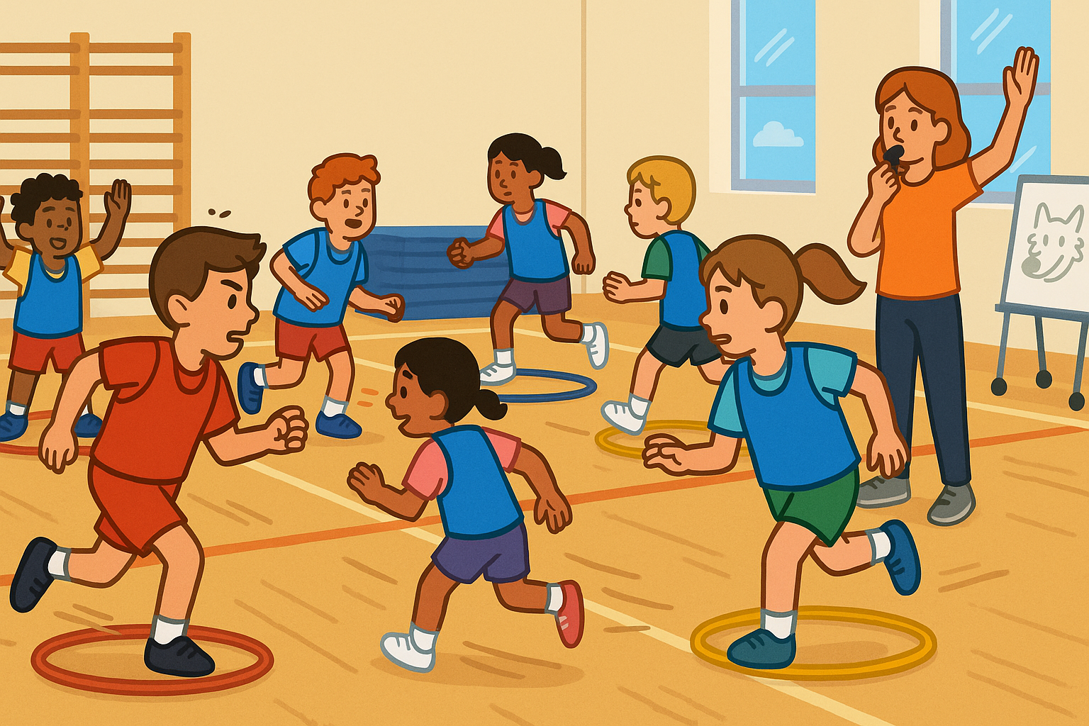 Al lobo es un juego de persecución y refugio para Primaria. Un alumno/a hace de lobo y el resto son cerditos que se mueven por la pista o el gimnasio entrando y saliendo de aros que hacen de “casitas”. Las rondas son cortas, con alta participación, cambios rápidos de ritmo y reglas fáciles de entender.