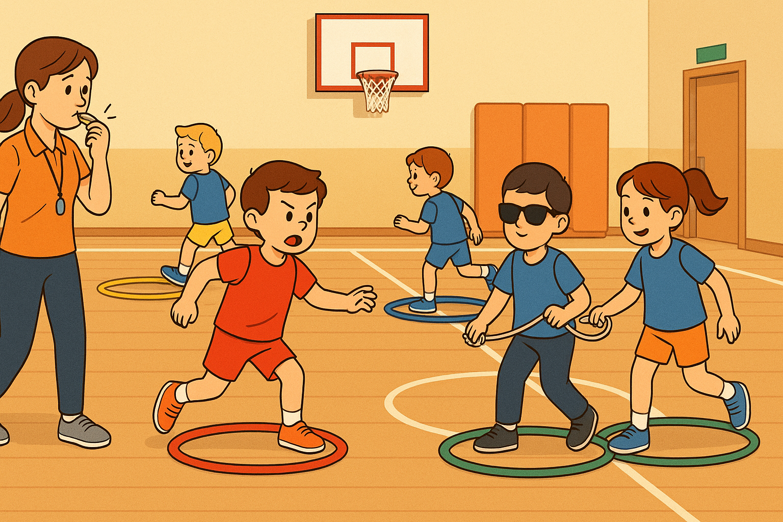 - “Poderes” para igualar: más refugios (añadir 2–4 aros extra), permitir mayor tiempo de refugio para el alumno/a ciego/a, o recortar su recorrido entre casas; alternativamente, alargar el de los oponentes (Estrategias para igualar la diferencia).