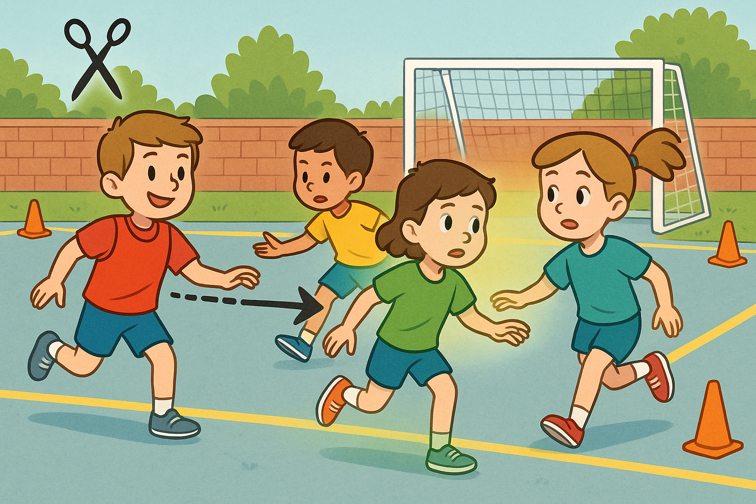 En Primaria, El Corta-Hilos favorece el movimiento continuo, la lectura del espacio y la toma de decisiones rápidas. La dinámica invita al grupo a colaborar para proteger a compañeros o desorientar al perseguidor mediante trayectorias cruzadas.