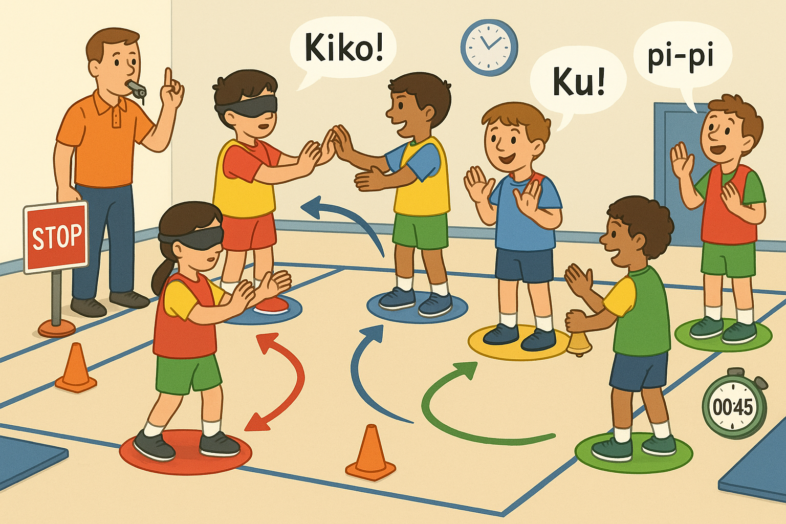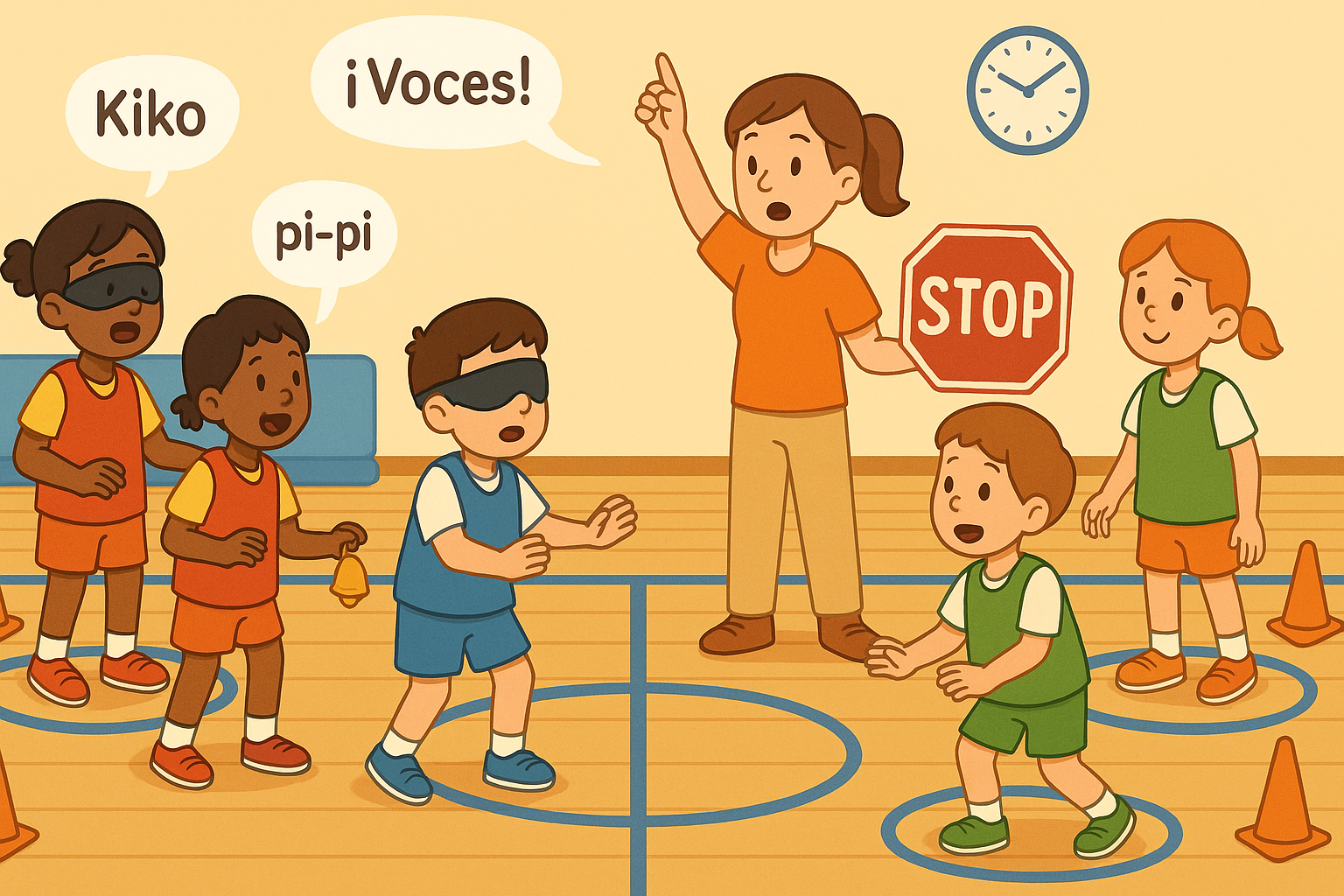 “Por parejas: uno con antifaz al centro, otro se reparte por la pista. A mi señal, el guía repite su clave de voz; el explorador camina con manos delante y busca solo por el sonido. Al tocar a su guía, vuelven al centro y cambian. Palabra de seguridad ¡STOP!: todos quietos. Nadie corre ni se toca hasta la meta. ¿Listos? ¡Voces!”