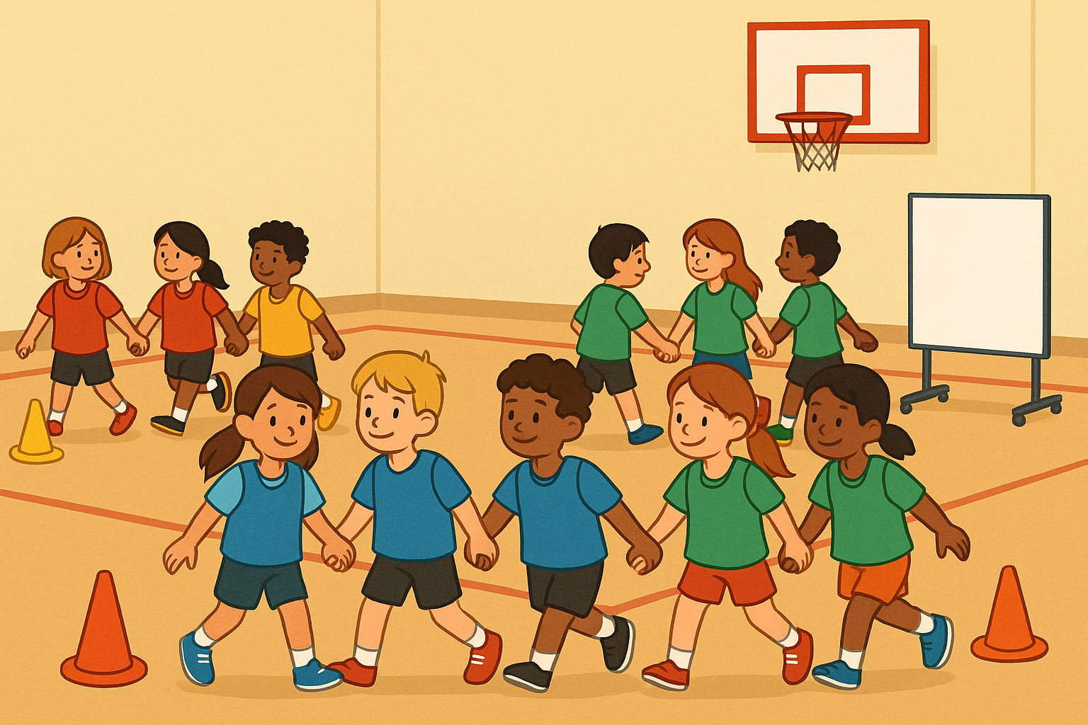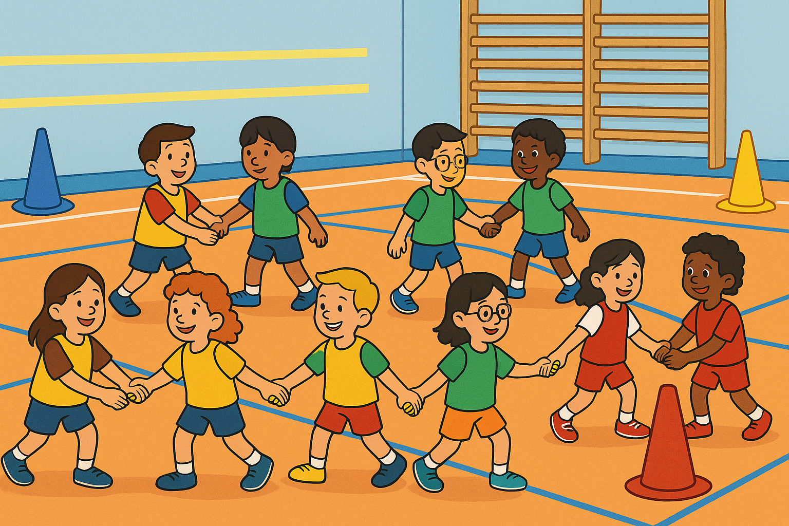 Se recomienda para ciclos de Primaria como actividad inicial o núcleo de sesión, con una duración de 8–12 minutos y en pista o gimnasio (también puede adaptarse a patio amplio). La dinámica fomenta la orientación espacial, la toma de decisiones y el control postural a través de trayectos claros y seguros.