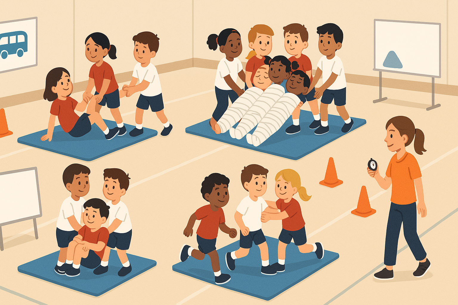 La sesión de los transportes cooperativos en educación física se organiza en cuatro estaciones por las que todos los grupos rotan cada 6–8 minutos. La meta es coordinar agarres estables, pasos controlados y comunicación previa antes de iniciar cada traslado. El docente equilibra los grupos por peso y confianza, delimita recorridos de 5 a 15 metros sobre suelo no resbaladizo y marca una señal sonora para los cambios.