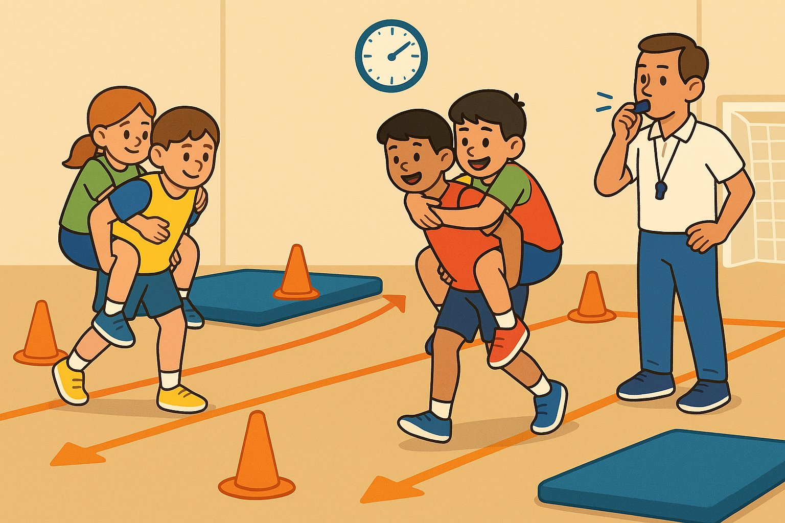 - Usar a el/la alumno/a como modelo, describir acciones clave, anticipar pasos del transporte y la zona de relevo; apoyo rítmico con voz/aplausos.
