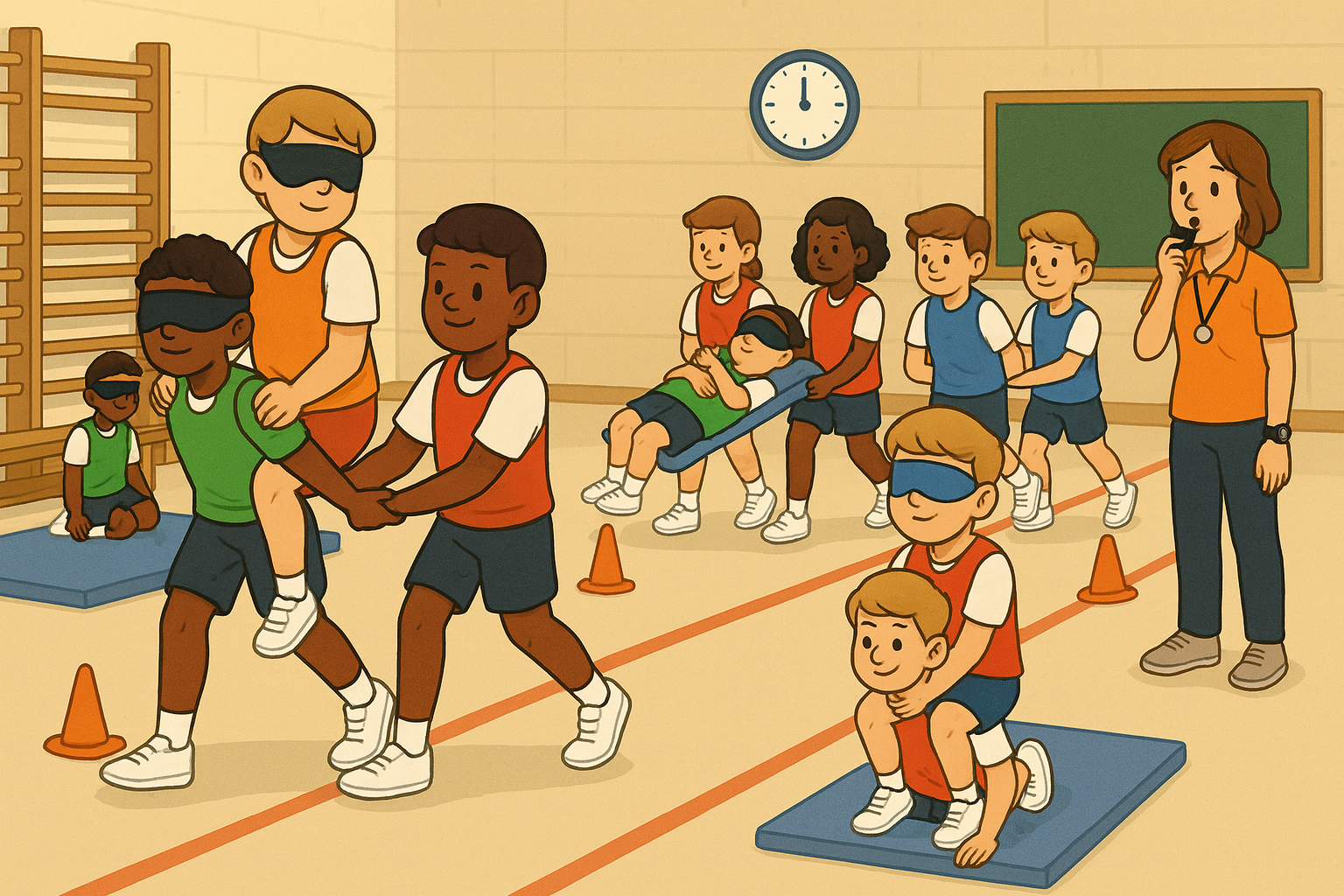 Transportes cooperativos en Educación Física es una actividad cooperativa con cuatro minijuegos centrados en trasladar a compañeros de distintas maneras. Su dinámica potencia la ayuda mutua, la comunicación y la confianza dentro del grupo.