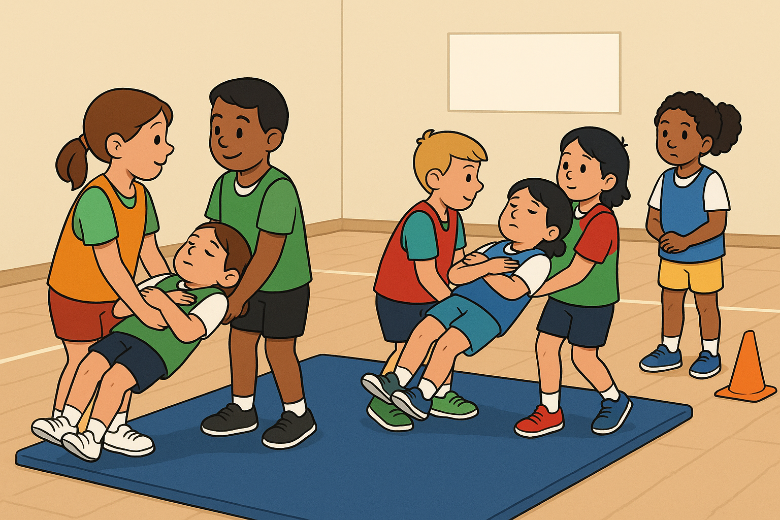 - Repartir roles y acordar agarres (hombros-antebrazos, “camilla” con colchoneta, tres puntos de apoyo, etc.).
